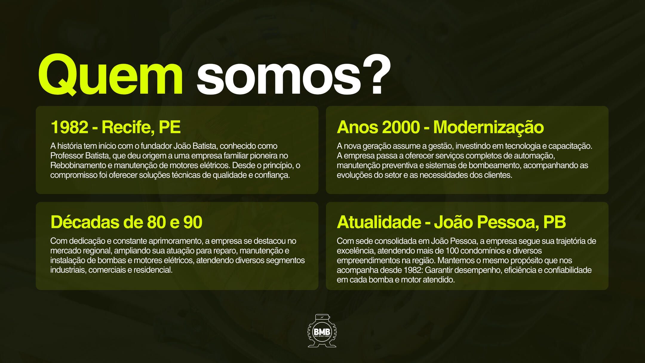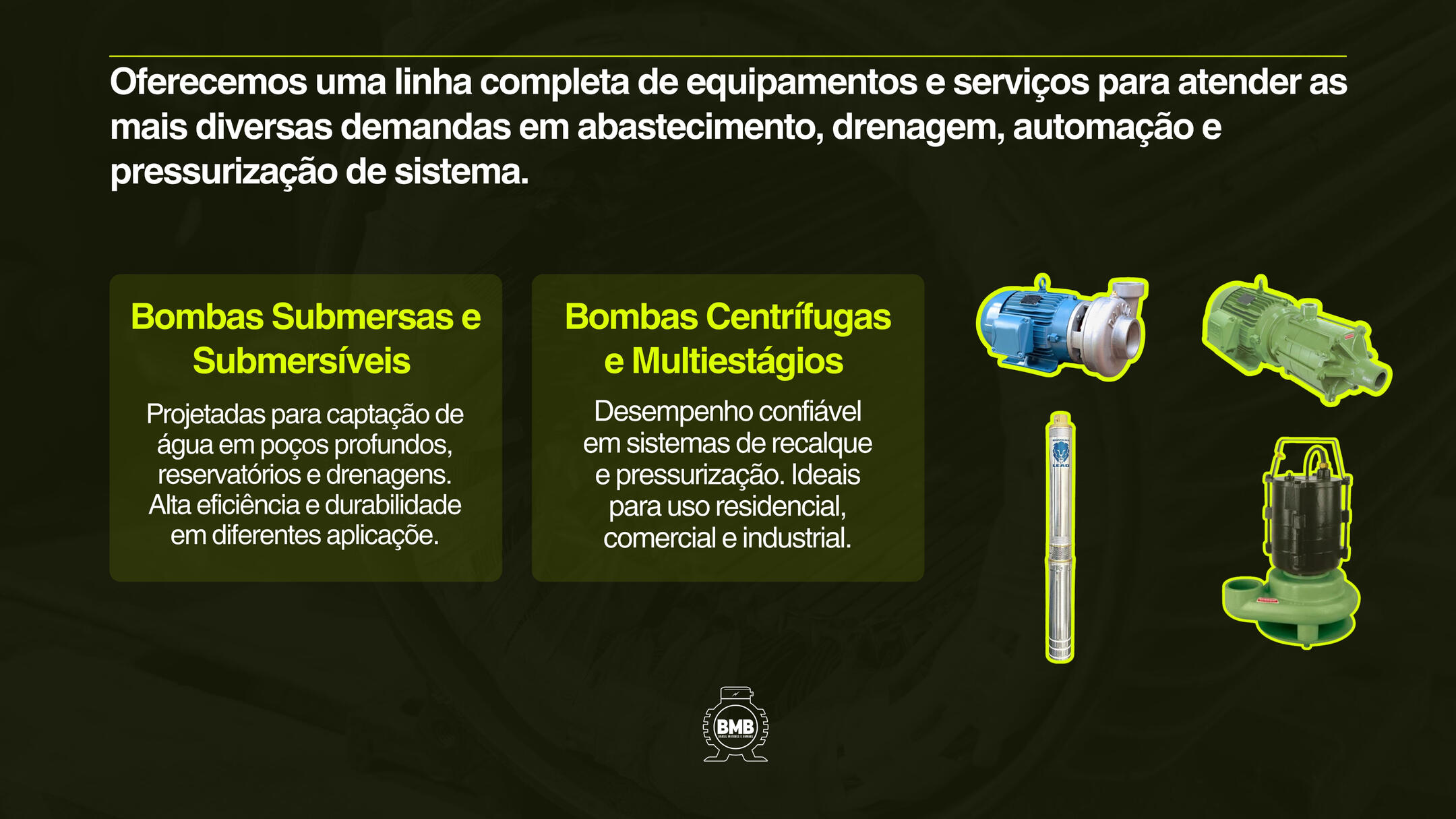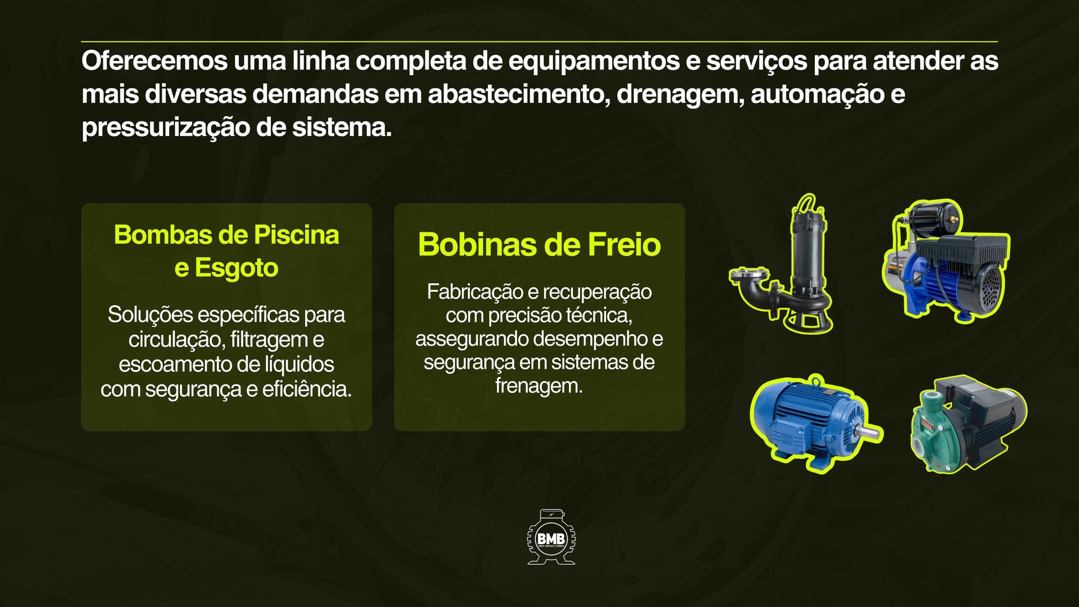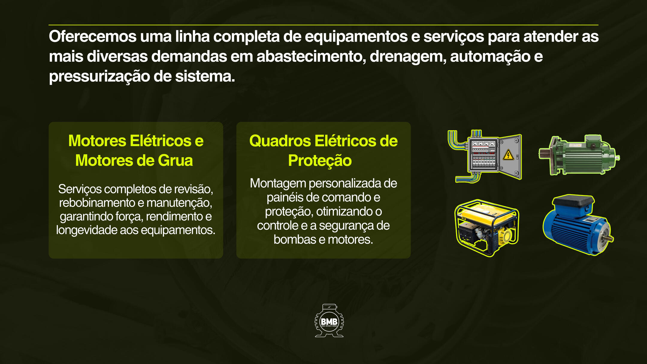 Somos uma empresa especializada em bombas e motores elétricos, oferecendo soluções eficientes e confiáveis para nossos clientes. Atuamos com rebobinamento, manutenção preventiva e corretiva, serviços de automação, sistemas trifásicos e monofásicos, além da montagem de quadros de comando. Trabalhamos com agilidade, qualidade e compromisso, garantindo o melhor desempenho dos equipamentos e a satisfação de quem confia em nossos serviços.